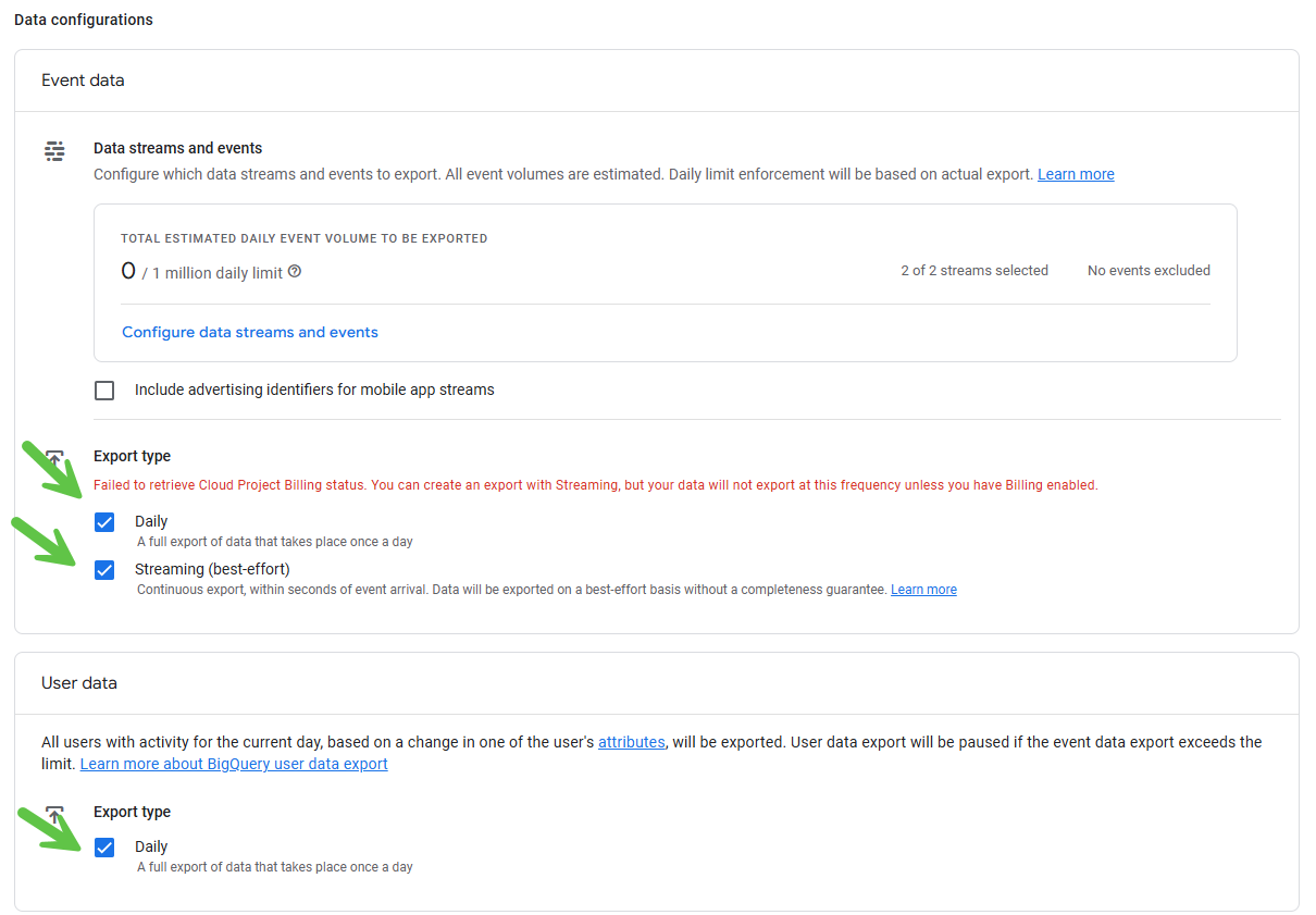 - Streaming - Select Streaming for live data streaming, allowing you to see revenues, customer activity, funnel events, and attribution in real time. Note: You may need to enable Google Cloud billing to enable streaming data feed.